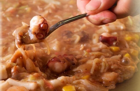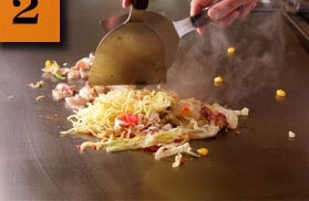 これで完成!鉄板に焦げ付いた「おこげ」を食べる感覚。もんじゃ専用の小さいコテ、通称「はがし」でおこげをはがしながら食べてください。